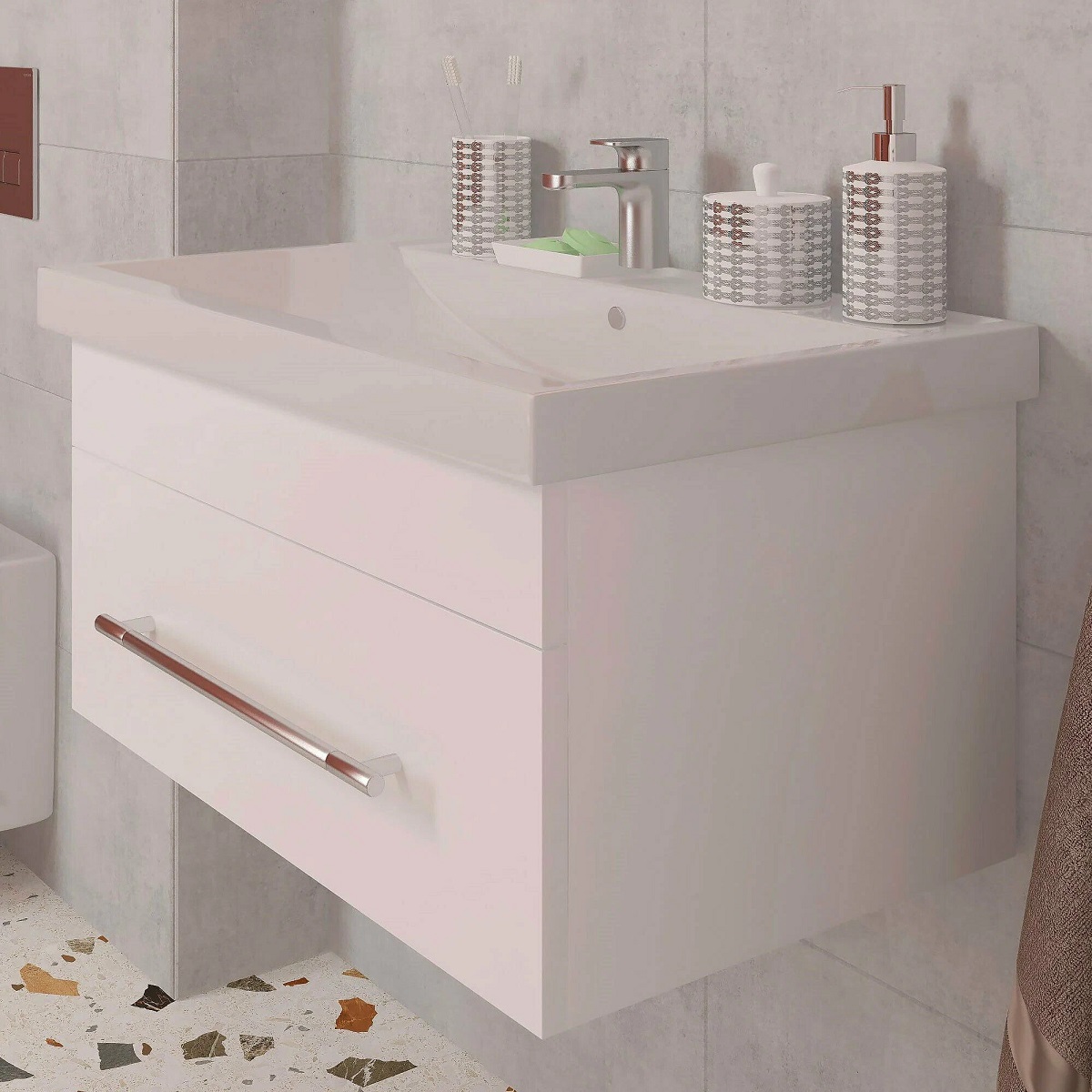 Продолжает топ лучших тумба белая подвесная для ванной EvaGold Leader 70. Она визуально придает легкость пространству за счет своего подвешенного состояния. Отсутствие ножек также обеспечивает быструю беспрепятственную уборку ванной комнаты. Фасады выполнены из влагостойкого МДФ белоснежного цвета. Раковина из санитарного фарфора прямоугольной формы обеспечивает максимум места для умывальных принадлежностей, которые можно разместить как на столешнице, так и на горизонтальной плоскости-полочке. Под раковиной располагается выдвижной ящик с шариковыми направляющими полного выдвижения и эргономичной удлиненной ручкой. EvaGold Leader 70 и Cersanit Como 70 – функциональное интерьерное решение, которое украсит любую ванную комнату. Товар относится к категории оптимального соотношения качества и цены и высоко оценен покупателями на Яндекс.Маркете. Гарантия производителя – 2 года.