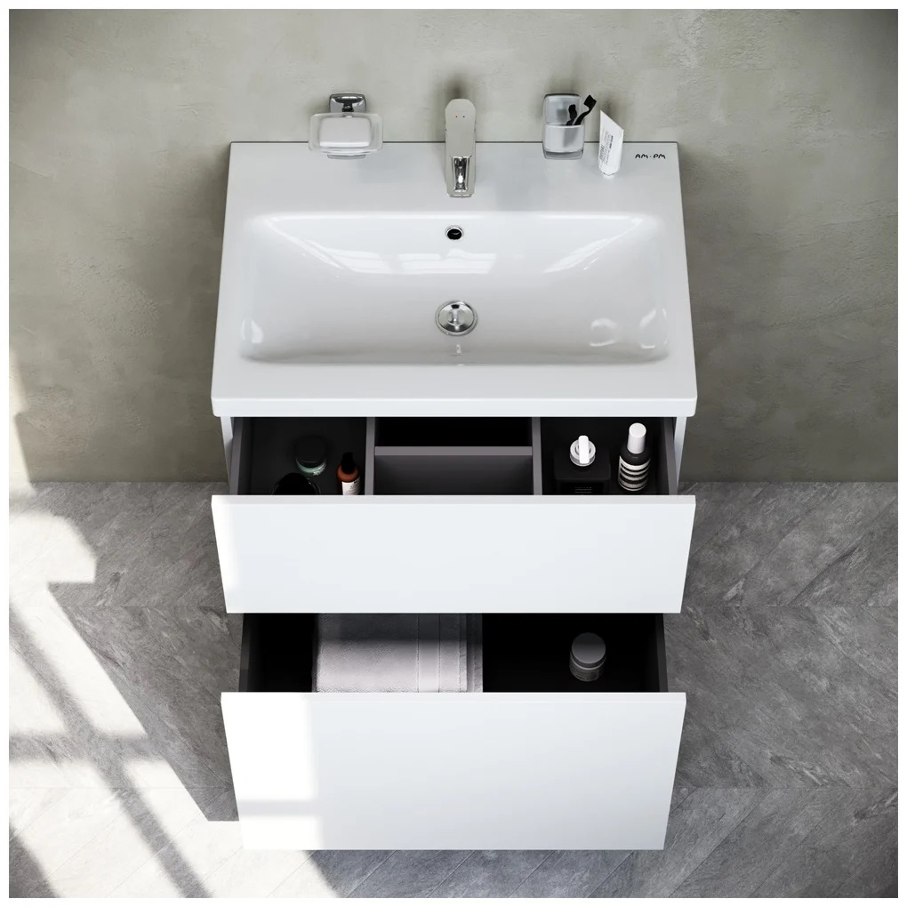 Данная подвесная тумба производится в ширине 60 и 75 см. Раковина выполнена из стекловидного фарфора в эргономичной форме прямоугольника. В комплекте также два выдвижных ящика, которые открываются при помощи нажатия (функция push-to-open). Благодаря технологии smart solution максимально возможная нагрузка на полки составляет до 35 кг. Комплект и в целом произведен с использованием передовых методов. Например, корпус обработан при помощи новейшей технологии семислойного окрашивания долговечной полиакриловой эмалью. Такое окрашивание – гарантия насыщенного цвета в течение всего срока службы.