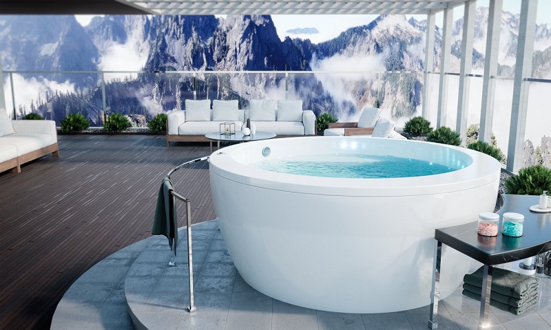 Лучшей по удобству, технологичности и функциональности становится премиальная акриловая ванна, которую выпускает крупный китайский бренд. Прежде всего следует отметить большой объем чаши и массивность конструкции. Подобная сантехника подойдет для больших домов или квартир с просторными ванными комнатами. Форма четверти круга с радиусом 151 см позволит свободно разместиться сразу двум людям. Внутреннее оснащение также рассчитано на совместное пользование: 2 подголовника, расположение форсунок. Вес устройства составляет 162 кг. Вместимость чаши достигает 250 л. По своей форме и внешнему виду напоминает мини бассейн, что поразит воображение даже искушенных любителей необычных решений.